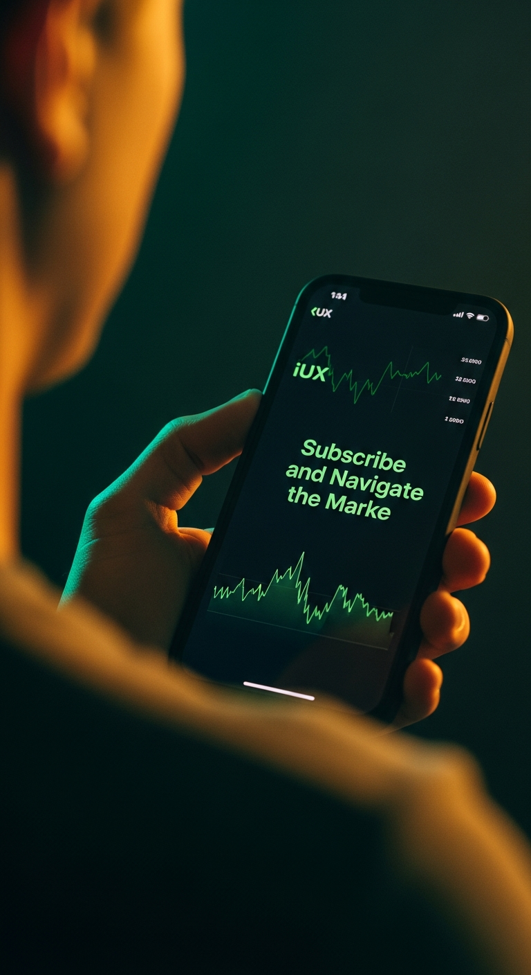 [SHOT] Cinematic close-up, Alexa Mini, 35mm anamorphic lens, slow 15% push-in, shallow depth of field at f/1.8, 24fps with subtle filmic motion blur. [SUBJECT] A single adult hand, medium skin tone, plain watch, holds a matte-black modern smartphone in portrait orientation. The thumb is still near the bottom edge of the screen. Dark charcoal shirt cuff visible, tailored, no logos. Face of the person is not visible. [PRODUCT] The phone's OLED display is sharply in focus and camera-facing. On the display, in a clean Inter-like sans-serif, the UI title reads exactly "Subscribe and Navigate the Marke" in bright iUX green (#30E88A) on near-black. Below the title, a single animated candlestick chart with subtle green and red candles. No other UI chrome, no notifications, no status bar clutter. [ENVIRONMENT] Environment: a matte-black brushed trading desk at late afternoon. A single warm rim light glances off the phone's bezel and the back of the hand. Fine dust particles drift through a shaft of gold light. A second defocused amber desk lamp sits deep in the background. Ambient SFX: low room tone, one soft distant keyboard click, no music. [STYLE] Style: photoreal cinematic fintech, teal-green-and-gold palette, low-key high-contrast, Alexa-class dynamic range. Gentle 35mm film grain. No stylisation, no cartoon, no illustration. [CRITICAL] The only readable text anywhere in the frame is "Subscribe and Navigate the Marke" on the phone display. Every other surface, sign, screen, label, paper and monitor in the environment must be free of readable text.