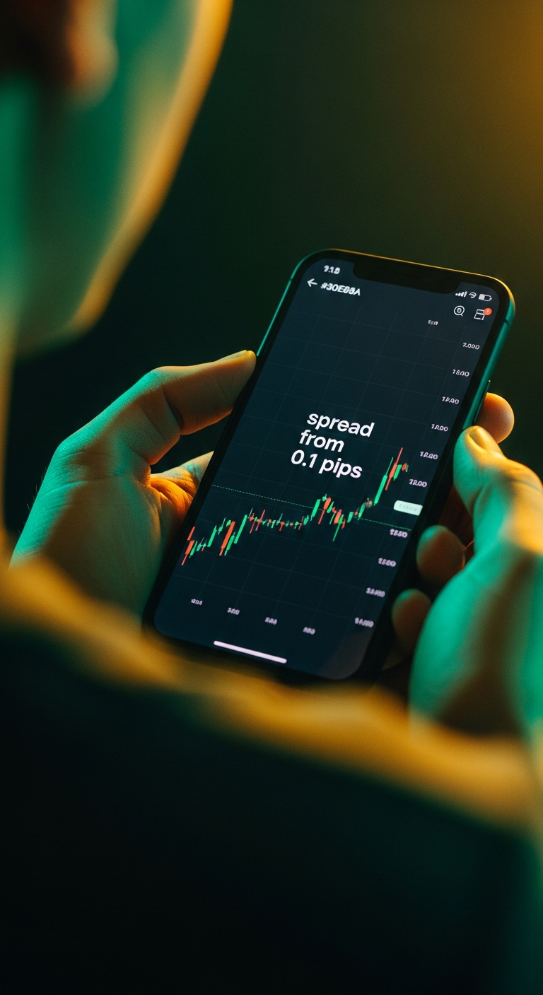 [SHOT] Cinematic close-up, Alexa Mini, 35mm anamorphic lens, slow 15% push-in, shallow depth of field at f/1.8, 24fps with subtle filmic motion blur. [SUBJECT] A single adult hand, medium skin tone, plain watch, holds a matte-black modern smartphone in portrait orientation. The thumb is still near the bottom edge of the screen. Dark charcoal shirt cuff visible, tailored, no logos. Face of the person is not visible. [PRODUCT] The phone's OLED display is sharply in focus and camera-facing. On the display, in a clean Inter-like sans-serif, the UI title reads exactly "spread from 0.1 pips" in bright iUX green (#30E88A) on near-black. Below the title, a single animated candlestick chart with subtle green and red candles. No other UI chrome, no notifications, no status bar clutter. [ENVIRONMENT] Environment: a matte-black brushed trading desk at late afternoon. A single warm rim light glances off the phone's bezel and the back of the hand. Fine dust particles drift through a shaft of gold light. A second defocused amber desk lamp sits deep in the background. Ambient SFX: low room tone, one soft distant keyboard click, no music. [STYLE] Style: photoreal cinematic fintech, teal-green-and-gold palette, low-key high-contrast, Alexa-class dynamic range. Gentle 35mm film grain. No stylisation, no cartoon, no illustration. [CRITICAL] The only readable text anywhere in the frame is "spread from 0.1 pips" on the phone display. Every other surface, sign, screen, label, paper and monitor in the environment must be free of readable text.